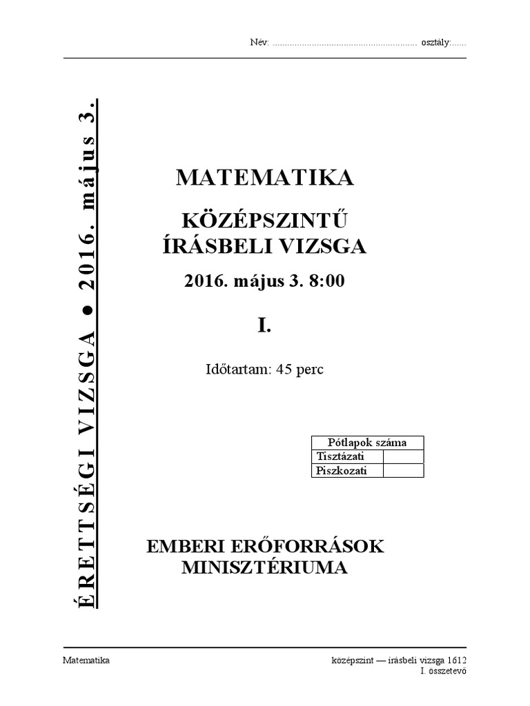 2016 Majusi Matematika Erettsegi Feladatlap Kozepszint